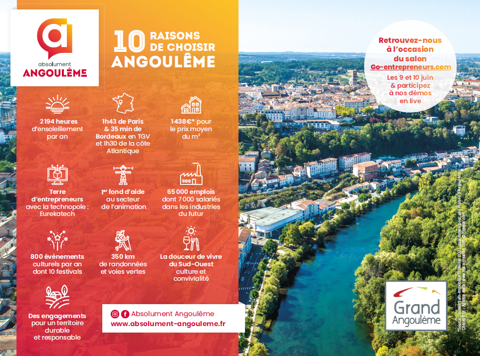 Au cœur de la Nouvelle Aquitaine, Angoulême bénéficie d'un cadre de vie idéal. Sa météo ensoleillée offre un climat idéal pour les plaisirs simples : diners en terrasse, pratique du canoë-kayak, balade dans la nature... L'ambiance authentique et conviviale reflète un art de vivre reconnu. Venez créer votre entreprise et profiter de la dolce vita angoumoisine ;-)