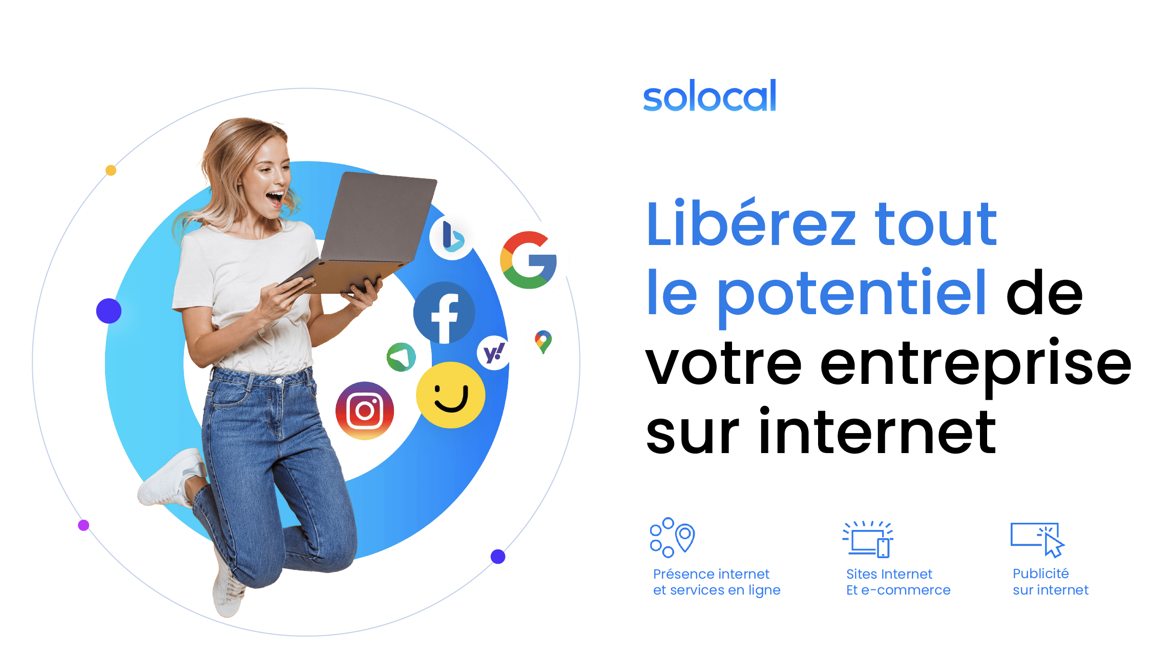 Révéler le potentiel de toutes les entreprises en les connectant à leurs clients grâce à des services digitaux innovants (Présence relationnelle avec une gamme d’offres Connect, Site Internet et sites de e-commerce, Publicité digitale) qu’elles peuvent piloter en toute autonomie via l’app Solocal Manager.
